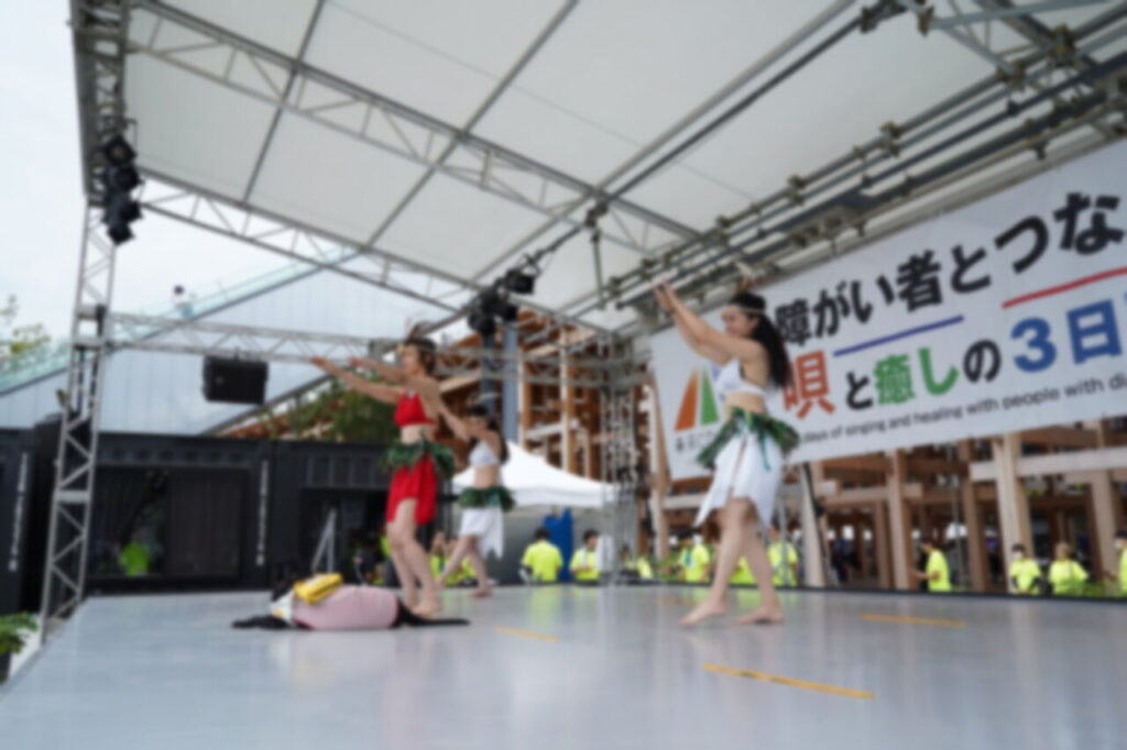 午前中は、和楽器演奏やのど自慢、フラダンスなどのパフォーマンスが行われ、私たちも観客としてしっかりと応援。 特に印象に残ったのは、他法人の視覚障がい者による堂々とした歌唱や演奏です。